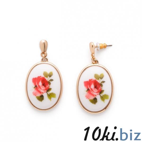 Серьги-гвоздики золотистого цвета украшены крупными декоративными вставками с цветочным принтом. Размеры: 2x4x2 см. Изготовлено во Вьетнаме.