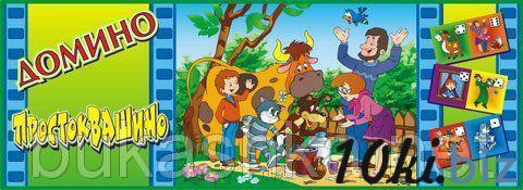 Домино "Простоквашино". Комплект состоит из 28 карт. Игроки выкладывают карты так, чтобы рисунки на прилегающих половинках были одинаковыми. Если у игрока нет нужной карты, он тянет ее из прикупа до тех пор, пока не сможет сделать ход. Выигрывает тот, кто первым избавился от карт. На картах изображены герои мультфильма "Простоквашино".