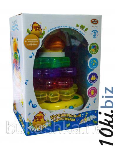 Пирамидка-неваляшка "Музыкальный цыпленок". Многоуровневая (уровни в форме кролика, щенка, теленка, слоненка). Стержень пирамидки оборудован кнопкой, которая нажимается в процессе нанизывания фигурок на него. В ходе этого игрушка запускает интересные свет-звуковые эффекты. Голова цыплёнка также служит кнопкой, которая воспроизводит забавные звуки кряканья и веселую мелодию.