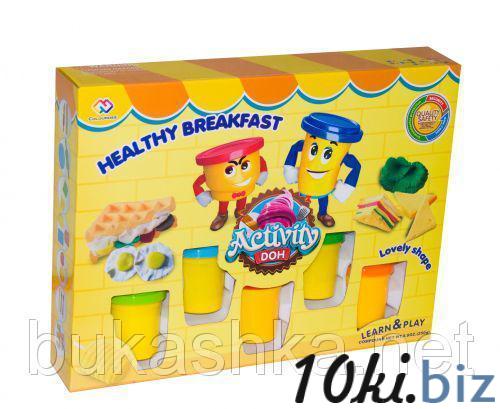 Пластилин "Здоровый завтрак". В наборе: 5 баночек с пластилином (формочки животных на крышке), формочки в виде еды (сыр, тост, овощи, фрукты, мясо и др.), пластиковые ножи и лопатки.