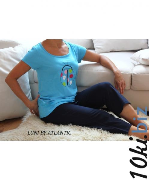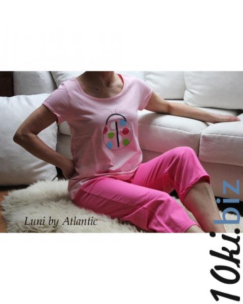 Хлопковые пижамы для женщин. Набор состоит из рубашки с короткими рукавами и брюки 3/4 длиной. Вырез отделан с трубопроводами, цветная печать на передней панели. Состав: 100% хлопок.