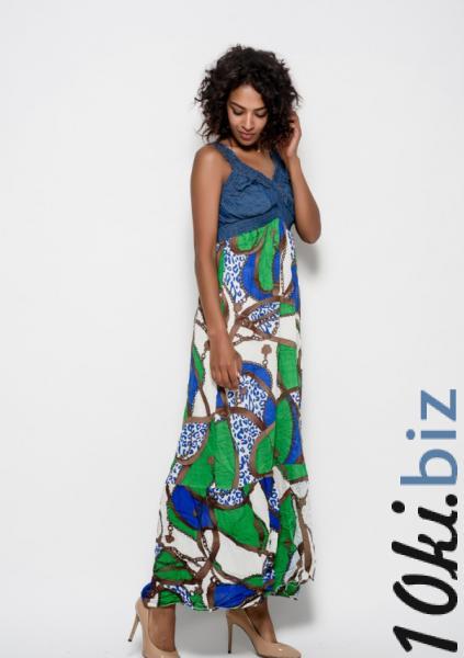Длинный в пол сарафан свободного кроя и А-силуэта с завышенной талией. Сарафан с лифом на резинках из синего джинс-коттона с широкими бретелями и американской проймой горловины. По низу сарафана широкий волан. Низ сарафана сшит из яркого коттона с геометрическим принтом.