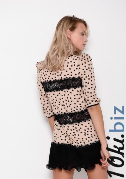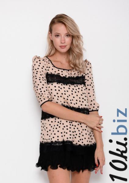 Коктейльное легкое шифоновое платье мини длины прямого комфортного силуэта. Платье бежевого цвета в черный горошек вариацией рукавов-фонариков длиной до локтя. Платье с шифоновым плиссированным воланом и ажурным черным кружевом.
