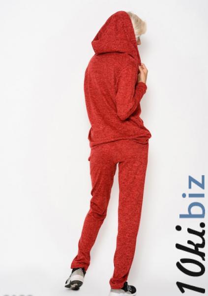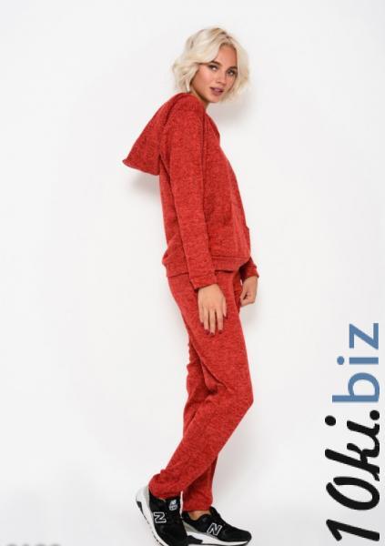 Меланжево-красный ангоровый демисезонный спортивный костюм с комфортным батником на манжетах, с капюшоном и небольшим V-образным вырезом и карманом-кенгуру. Штаны прямого удобного кроя средней посадки.