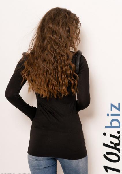 Тонкий батник выполненный из однотонного черного эластичного материала. Изделие декорировано необычными объемными вставками на проймах рукавов. Модель удлиненного прямого облегающего кроя, оснащена удобными длинными рукавами и углубленной проймой горловины на тонкой кособейке и широким манжетом по нижнему краю.