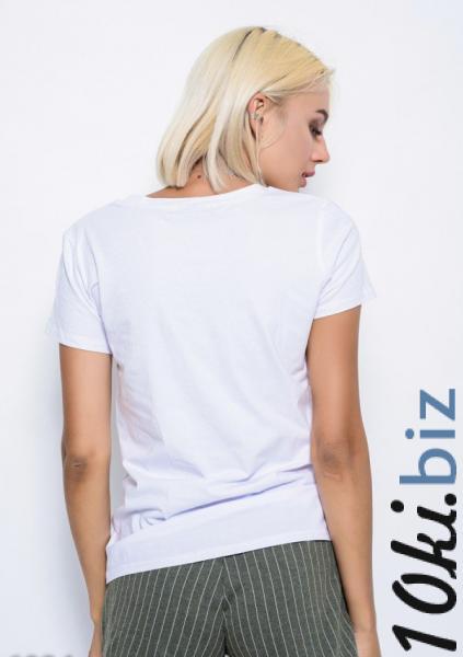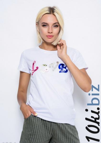 Трикотажная белая удлиненная базовая футболка в стиле кэжуал с короткими рукавами и с круглой обработанной проймой горловины. Футболка с декором на груди из плотных нашивок в виде разноцветных латинских букв, инкрустированных стразами, пайетками и жемчугом.