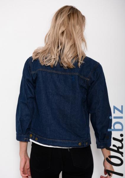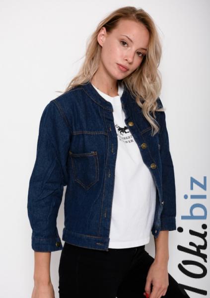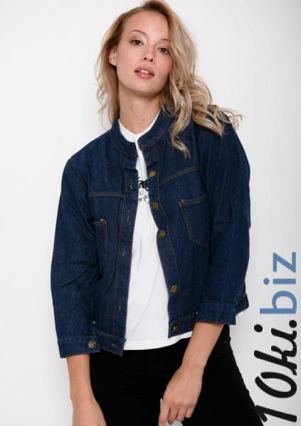 Оригинальная укороченная однотонная синяя куртка из практичного джинса с круглым воротником. Модель на пуговицах с накладными карманами на груди.