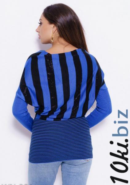 Черный с синими полосками оригинальный удлиненный свитер с длинным нижним манжетом и декором из страз. Модель облегающего удлиненного кроя с длинными однотонными рукавами на приспущенных проймах и закрытым вырезом горловины.