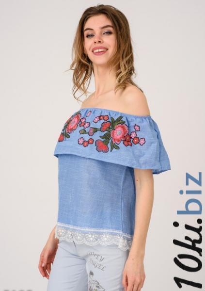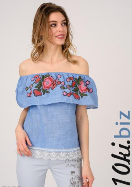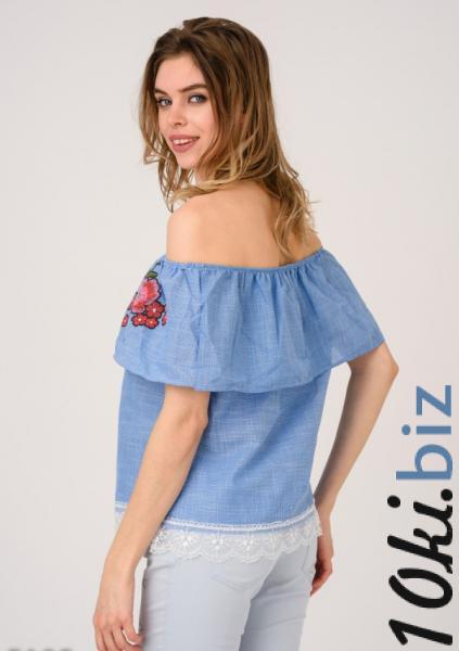 Светло-синяя хлопковая блузка свободного покроя в едва заметную белую клетку. Модель с широким отворотом, с белым кружевом по нижнему краю. На отвороте - красные цветы с зелеными листочками. Очаровательная и очень романтичная вещь.