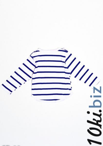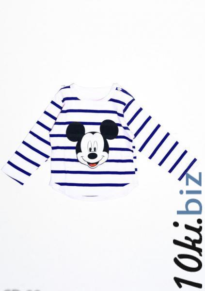 Белый батник с длинными рукавами выполненный из практичного трикотажа с горизонтальными полосками синего цвета. Изделие декорировано пуговицами на плечах и принтом на груди с Микки Маусом. Модель прямого кроя со скругленными нижними срезами и полукруглой гордовиной на белых кособейках.