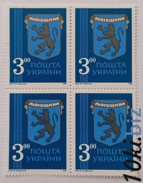 1993 № 35 квартблок почтовых марок Герб Львовщины номинал 3-00 Филателия в Украине