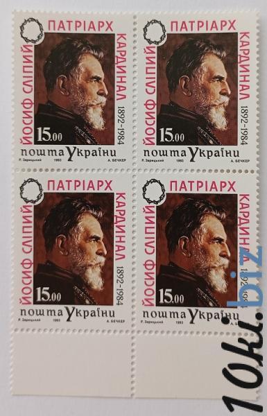 1993 № 37 квартблок почтовых марок Патриарх кардинал Слепой номинал 15-00 (1892-1984) Филателия в Украине