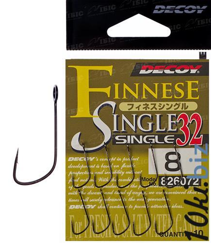 Крючок Decoy Single 32 предназначен для оснащения силиконовых приманок при ловле хищной рыбы. Что примечательно, форма крючка была разработана в сотрудничестве с отечественными рыболовами-спортсменами, которые считаются одними из лучших спиннингистов в мире. Правильно подобранная толщина проволоки и особый изгиб, позволяют приманке лучше удерживаться на крючке и рыбе значительно сложнее стащить её. Также, такая форма способна выдержать большие нагрузки и меньше подвержена разгибанию. Single 32 имеет увеличенное ушко для большей свободы при осуществлении проводки.