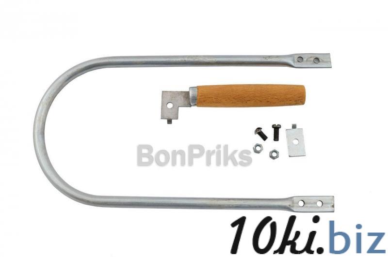 Ручной лобзик изготовлен из стальной трубки и имеет деревянную рукоятку. Полотна зажимаются винтовым механизмом.
