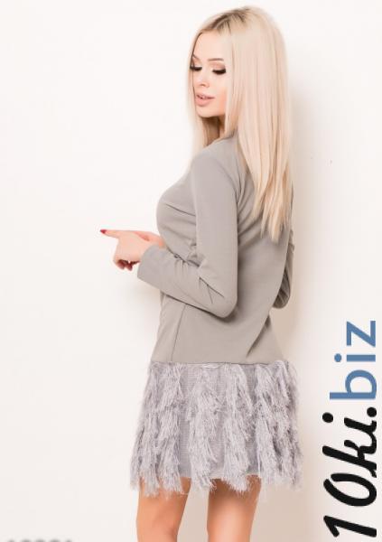 Серое мини платье для особого случая выполненное из практичного комбинированного трикотажа с широкой нижней вставкой с объемной бахромой. Модель декорирована глухой горловиной и длинными прямыми рукавами. Платье прямого свободного кроя с заниженной талией в стиле Арт Деко.