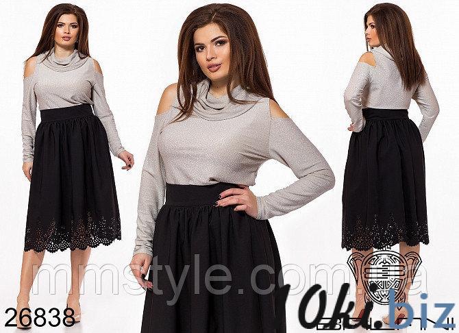 Размер на фото: 48-50 Материал: трикотаж с люрексом, костюмка, на юбке потайная змейка сбоку Цвет: черный Длина изделия: кофта 62 см. рукав 53/45 см. юбка 77 см.