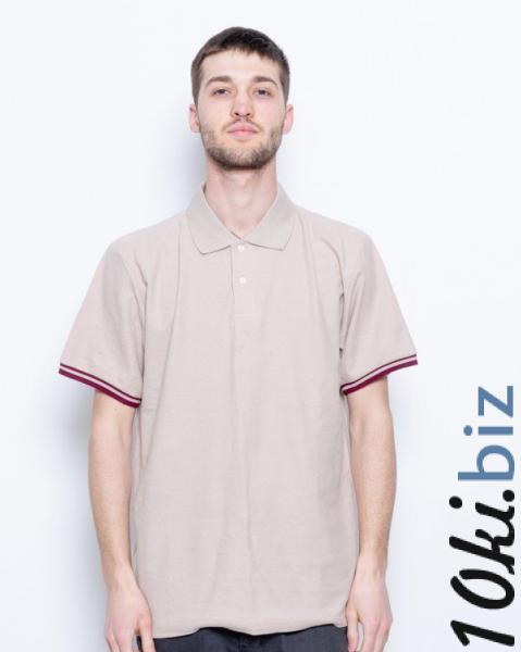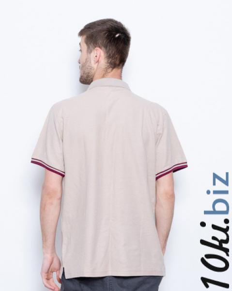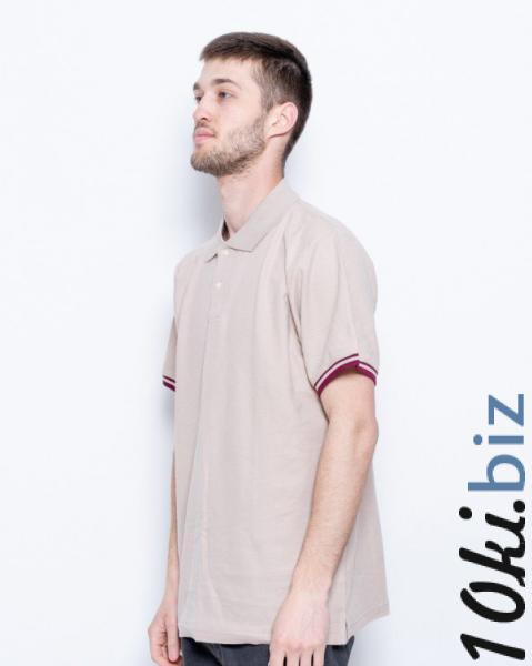 Повседневная однотонная бежевая футболка-поло из эластичного комбинированного трикотажа. Модель свободного прямого кроя с короткими рукавами оснащенными бежево-белыми манжетами и небольшими боковыми разрезами. Модель оснащена трикотажным эластичным воротником с планкой на пуговицах.