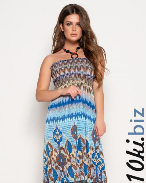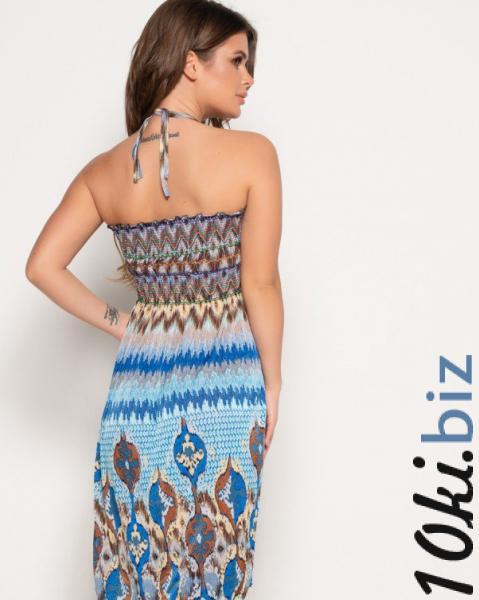 Летний сарафан в голубых тонах выполненный из практичного приятного к телу масла с принтом-орнаментом. Модель длиной до колен с лифом-жаткой и зигзагообразными декоративными поперечными нитями. Изделие открывает плечи и фиксируется при помощи бретели-завязки декорированной этническими бусинами.