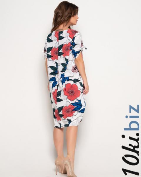 Женское платье для повседневной носки выполненное из софта с ярким цветочным крупным принтом на белом фоне. Модель прямого свободного кроя с длиной ниже колен и боковыми втачными карманами. Изделие оснащено полукруглой не глубокой горловиной и короткими рукавами присборенными тесемками.