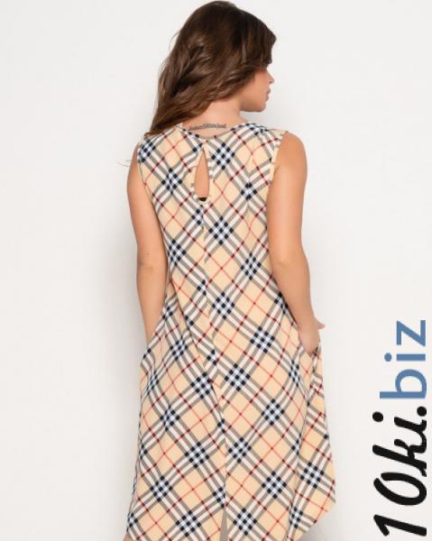 Клетчатый тонкий сарафан из бежевого софта со свободным кроем. Модель асимметричной лаконичной длины с закрытой горловиной и вырезом на спине. Подол изделия декорирован кулиской с небольшой завязкой, по бокам карманы.