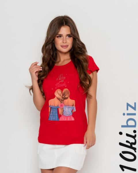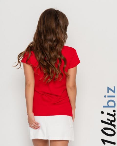Красная легкая женская футболка сшитая из хлопкового тонкого трикотажа. Передняя часть изделия декорирована ярким цветным принтом. Модель традиционного кроя с рукавами короткой длины и полукруглым вырезом горловины.
