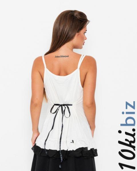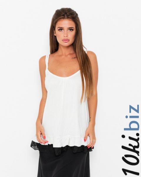 Белая удлиненная майка расклешенного свободного кроя из эластичного однотонного трикотажа и вшитым тонким пояском. Модель на тонких бретельках декорирована двойным нижним воланом и шифоновой черной вставкой.