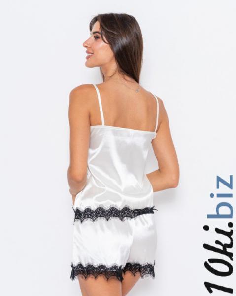 Белая пижама из не эластичного тонкого атласа с ажурным французским кружевом черного цвета. Модель состоит из свободного топика прямого кроя с тонкими бретельками и короткими шортиками на поясной резинке.