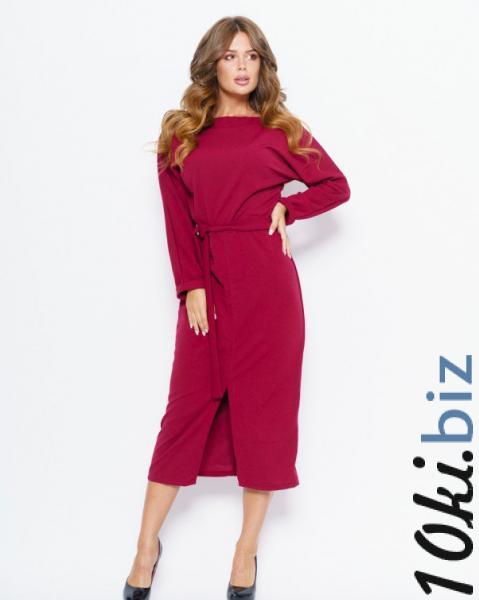 Бордовое однотонное повседневное платье миди длины с длинными цельнокроенными рукавами оснащенными подворотами. Модель с разрезом спереди и съемным поясом имеет прямой крой и горловину-лодочку. Модель сшита из комбинированного трикотажа низкой эластичности.
