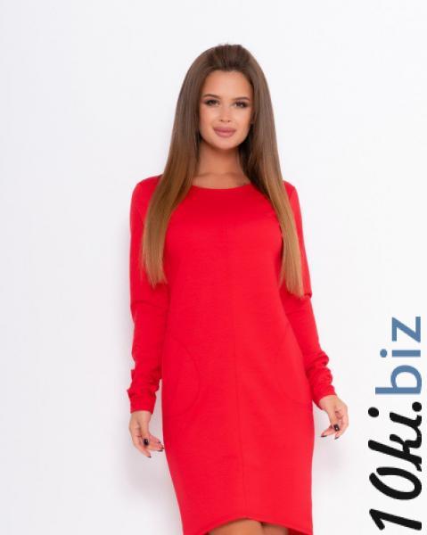 Асимметричное красное платье сшитое из однотонной трикотажной двухнити. Платье с длинными рукавами оснащено боковыми втачными полукруглыми карманами и не глубокой горловиной полукруглой формы. Изделие прямого свободного асимметричного кроя с длиной до колен и декором в виде объемных швов внахлест.