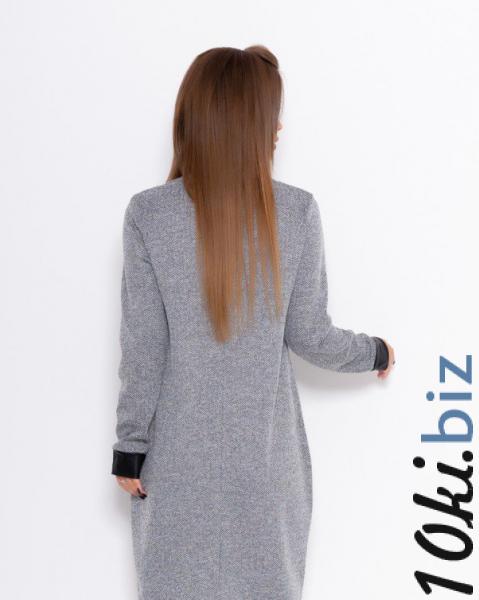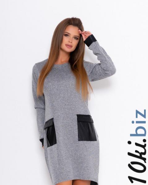 Повседневное слегка ассиметричное платье из эластичного фактурного меланжево-серого трикотажа. Изделие прямого кроя с длиной до колен и полукруглой проймой горловины. Платье оснащено длинными рукавами с манжетами из эластика и накладными кармами с клапанами также из эластика.