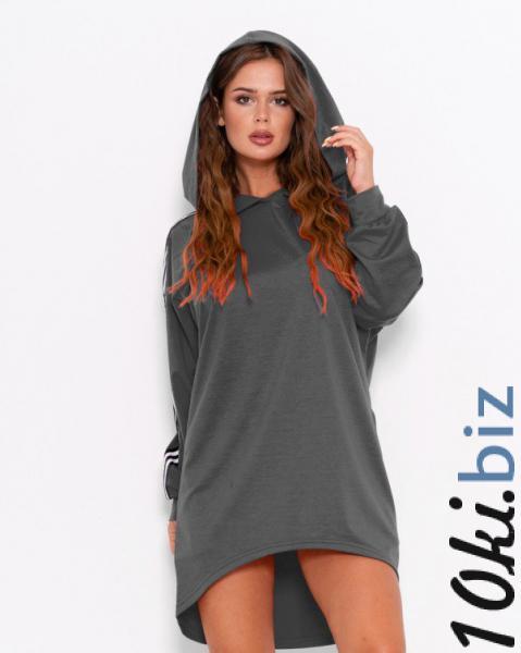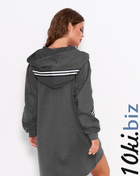 Темно-серое спортивное платье из двухнитного трикотажа с короткой асимметричной длиной и прямым свободным кроем. Изделие универсального назначения платья-туники оснащено капюшоном, карманами по бокам и декорировано двумя контрастными полосками.