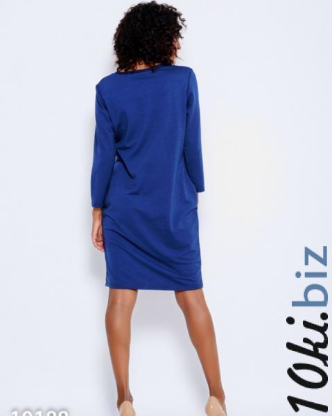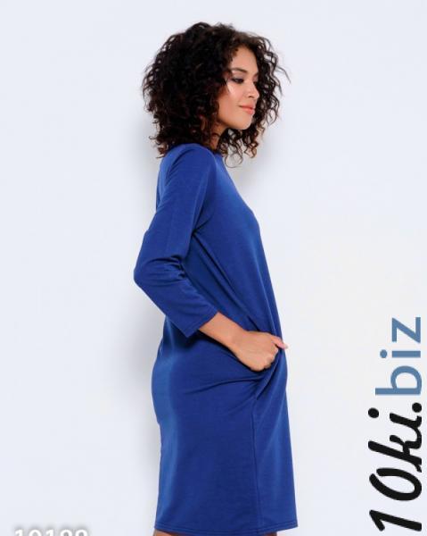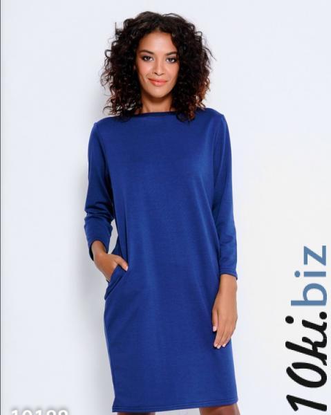 Синее однотонное платье из практичного двухнитного трикотажа с прямым свободным кроем и длиной выше колен. Модель оснащена длинными рукавами и карманами по бокам. Модель демисезонного повседневного назначения с полукруглой проймой горловины.