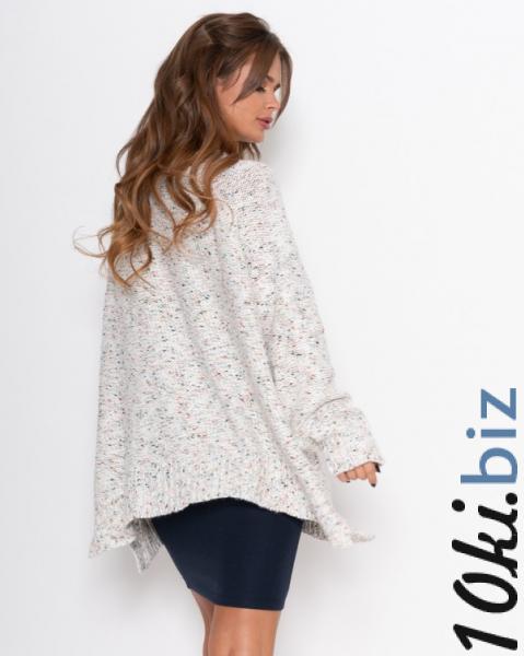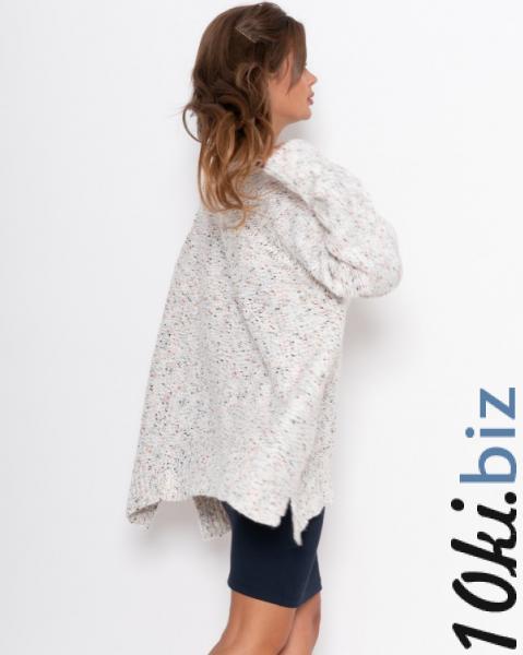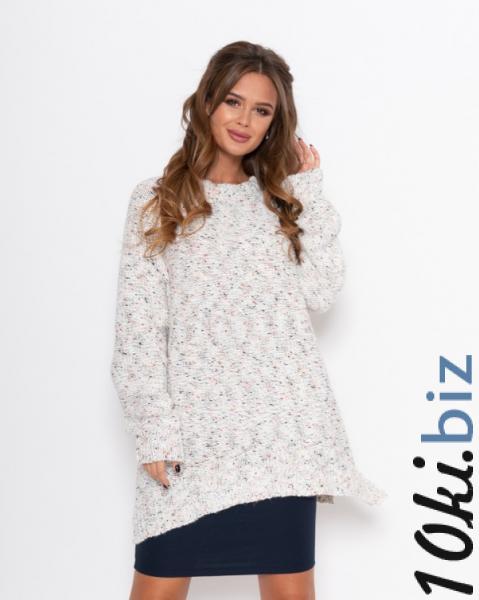 Мягкая и уютная белая туника выполненная в технике крупной вязки с длинными рукавами-реглан. Изделие фасона оверсайз с удлиненным кроем, разрезами по нижнему краю и манжеткой на закрытой горловине.