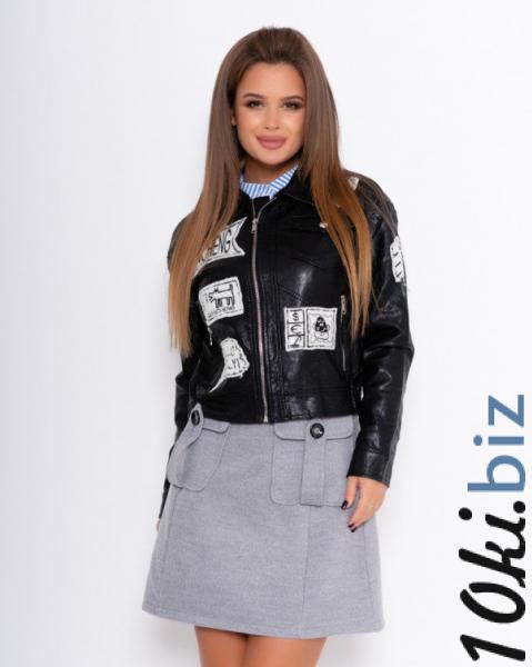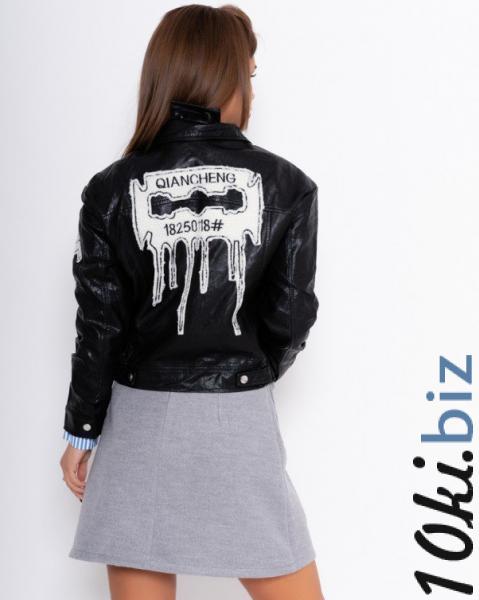 Черная демисезонная куртка с подкладом выполненная из мягкой эко-кожи и декорированная белыми шерстяными принтованными нашивками с войлоком. Модель на молнии с воротником, длинными рукавами и тремя карманами.