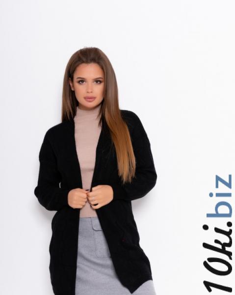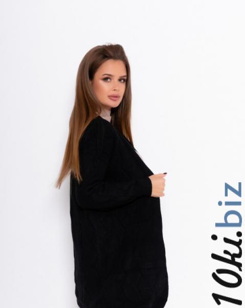 Черный теплый удлиненный кардиган прямого кроя без застежек. Модель с длинными свободными рукавами на манжетах выполнено из шерстяной плотной нити декоративной вязки.