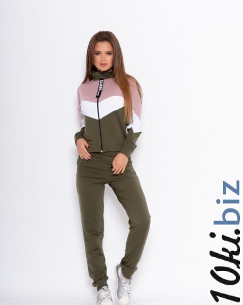 Демисезонный спортивный костюм цвета хаки выполненный из двухнитного трикотажа с бело-розовой вставкой. Толстовка на молнии оснащена воротником-стойкой, длинными рукавами и манжетами. Спортивный штаны прямого кроя с манжетами оснащены боковыми карманами и поясной резинкой.