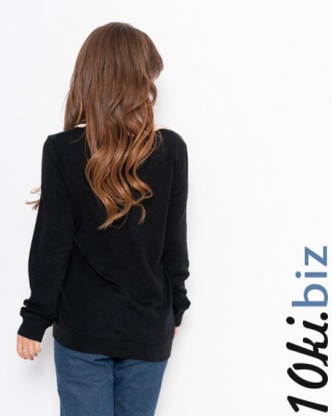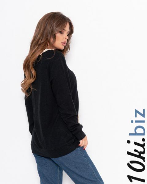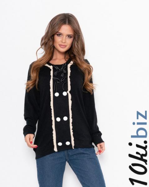 Черный демисезонный эластичный свитер из ангорового трикотажа с небольшой манжеткой на полукруглой горловине. Модель прямого присборенного нижним манжетном кроем оснащена длинными рукавами и декорирована широкой вертикальной передней планкой с кружевом, пуговицами и бантами.