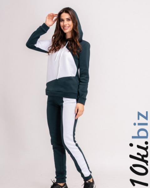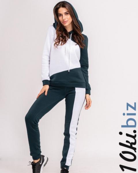 Зеленый с белыми вставками теплый спортивный костюм из трикотажа на флисе. Толстовка прямого кроя оснащенная капюшоном и длинными рукавами. Брюки на манжетах с прямым кроем и боковыми карманами.