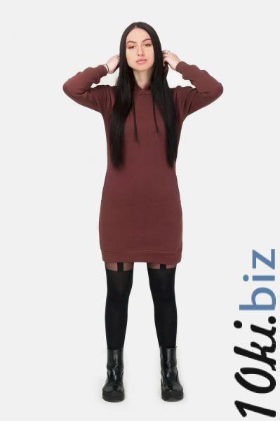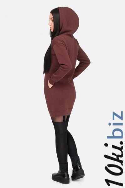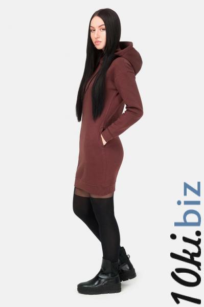Трикотажная коричневая туника удлиненного кроя с начесом и капюшоном Блузки и туники женские в Украине