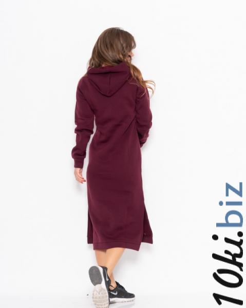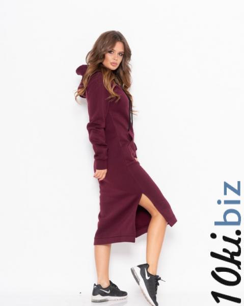 Бордовое зимнее спортивное платье с манжетами выполненное из трикотажа на флисе. Изделие прямого кроя миди длины с боковыми разрезами. Модель с вместительным карманом кенгуру и капюшоном оснащена длинными рукавами.