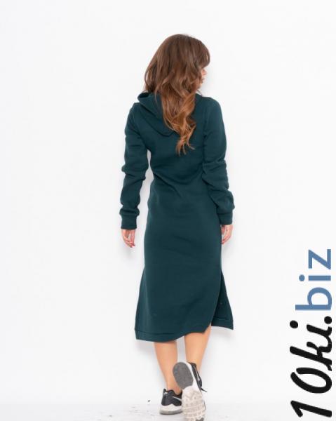 Зеленое очень теплое и комфортное спортивное платье с манжетами и капюшоном выполненное из трикотажа на флисе. Модель с вместительным карманом оснащена длинными рукавами. Изделие прямого кроя с боковыми разрезами и миди длиной.