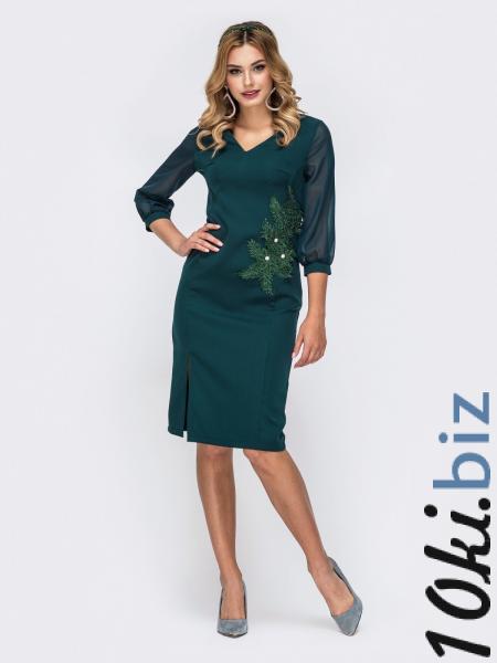 Силуэтное платье-футляр из костюмного крепа с флористической нашивкой на полочке. Изделие в V-образным вырезом горловины и невысоким разрезом. Станет идеальным вариантом для обладательниц типа фигуры «прямоугольник», «песочные часы».