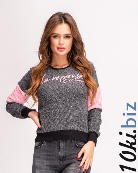 Теплая черная толстовка прямого кроя выполненная из меланжевого ангорового трикотажа с розовой надписью. Модель с манжетами оснащена длинными рукавами с вставками из розового плюшевого велсофта.