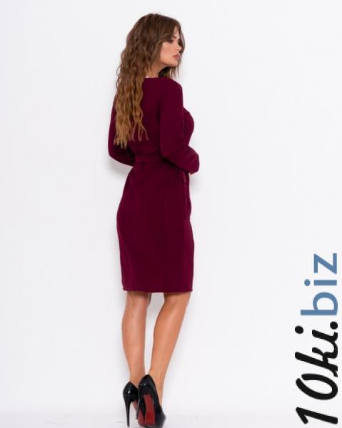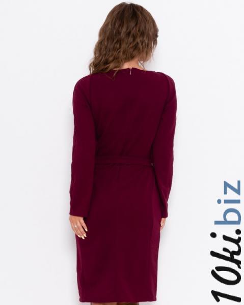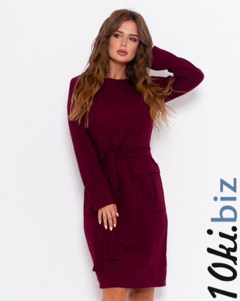 Демисезонное офсиное бордовое платье декорированное двумя накладными карманами с клапанами выполненное из комбинированного трикотажа. Платье застегивается на спинке при помощи молнии и приталено съемным поясом. Изделие с приталенным кроем, длиной до колен и оснащено длинными рукавами.