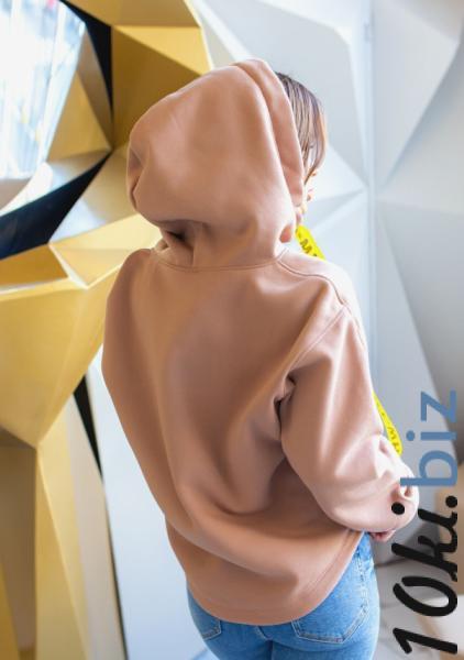 Бежевая трикотажная теплая толстовка в стиле оверсайз с прямым свободным кроем и удлиненной спинкой. Изделие оснащено защитным капюшоном с принтованной белой тесьмой. Толстовка с потайными карманами и длинными рукавами присборенными манжетами.