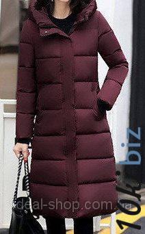 Женский удлиненный пуховик, утепленный синтепоном. Воротник-стойка, плавно переходит в капюшон, капюшон не съёмный, рукава с манжетом и двумя удобными горизонтальными карманами по бокам. Застёгивается на двойную молнию и кнопки.