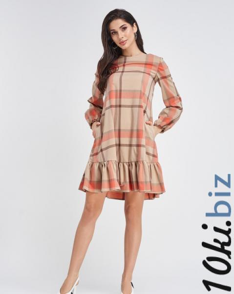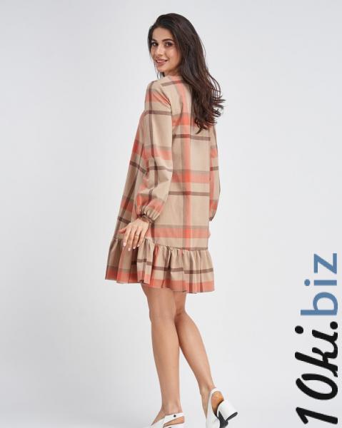 Бежевое клетчатое демисезонное платье из коттоновой ткани с боковыми карманами. Изделие свободного расклешенного кроя с воланом по нижнему краю и полукруглой проймой горловины. Платье оснащено длинными рукавами присборенными резинками на манжетах.
