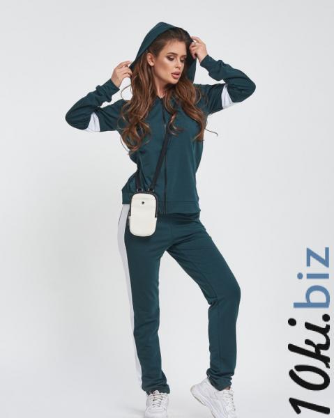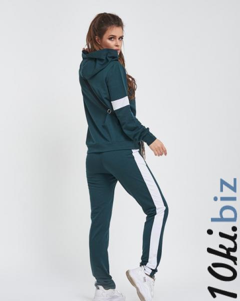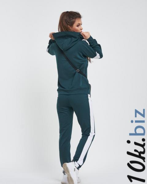 Молодежный спортивный костюм сшитый из зеленого двухнитного трикотажа декорированный белыми вставками. Спортивные штаны прямого кроя оснащены эластичной поясной резинкой и карманами декорированы контрастными лампасами. Толстовка на молнии с манжетами и длинными рукавами оснащено капюшоном и боковыми карманами с листочками.