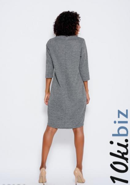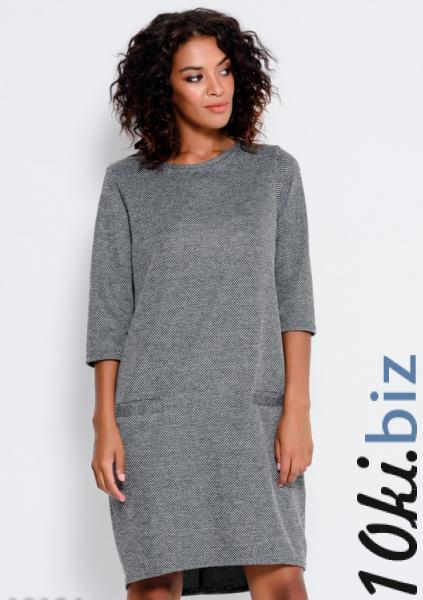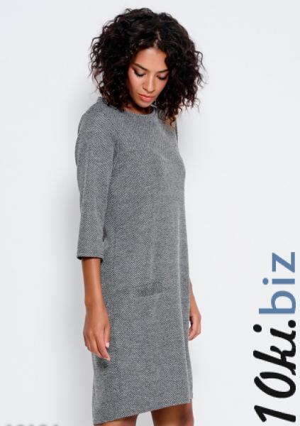 Демисезонное платье для повседневного ношения из практичного двунитного трикотажа серого цвета с мелким орнаментом на ткани. Модель прямого свободного кроя с рукавами длиной 3/4 и круглой проймой горловины. Модель асимметричной длины до колен со слегка удлиненной спинкой. Спереди платья два удобных потайных кармана.