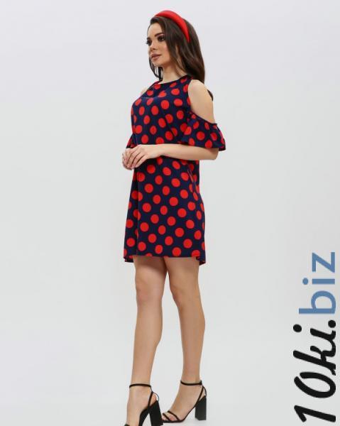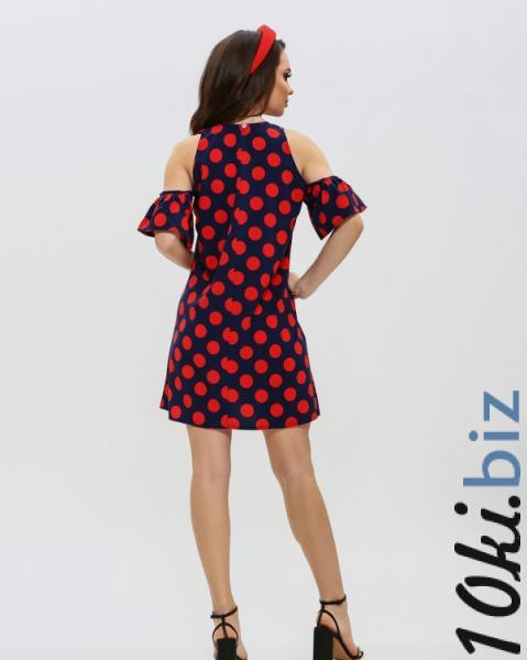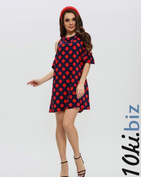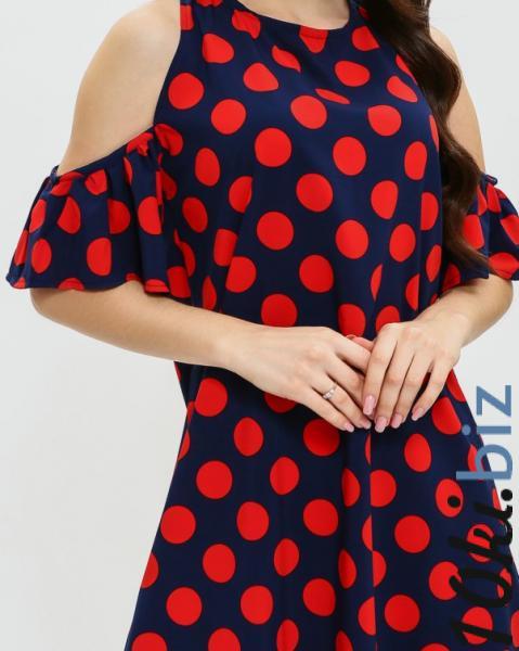 Сине-красное в крупный горошек свободное расклешенное платье-трапеция короткой длины. Модель с полукруглой горловиной и воланами на плечах выполнено из софта.